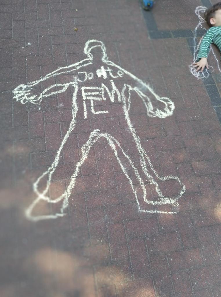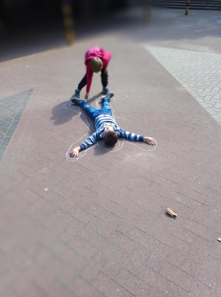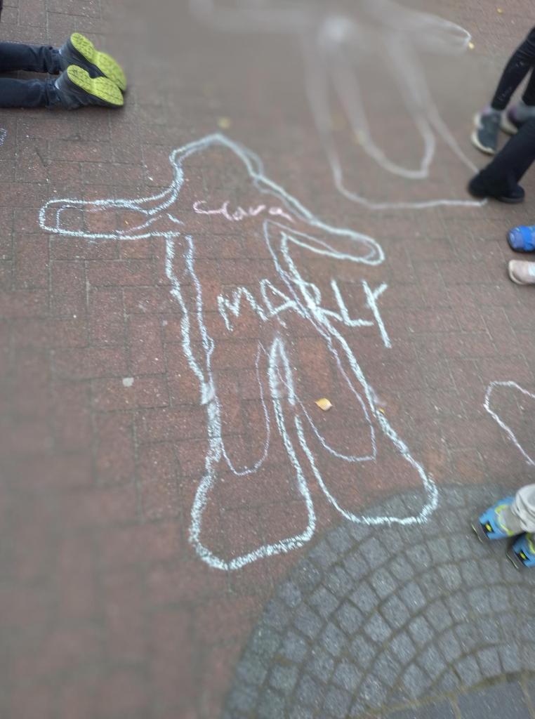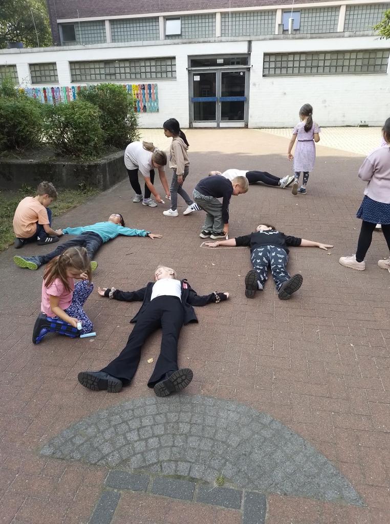 Heute haben die Klassen 1c und 3c ihre Patenstunde zum gemeinsamen Malen auf dem Schulhof genutzt. In die Umrisse der Großen wurden die Umrisse der Kleinen gemalt. Die Kinder hatten viel Freude dabei.