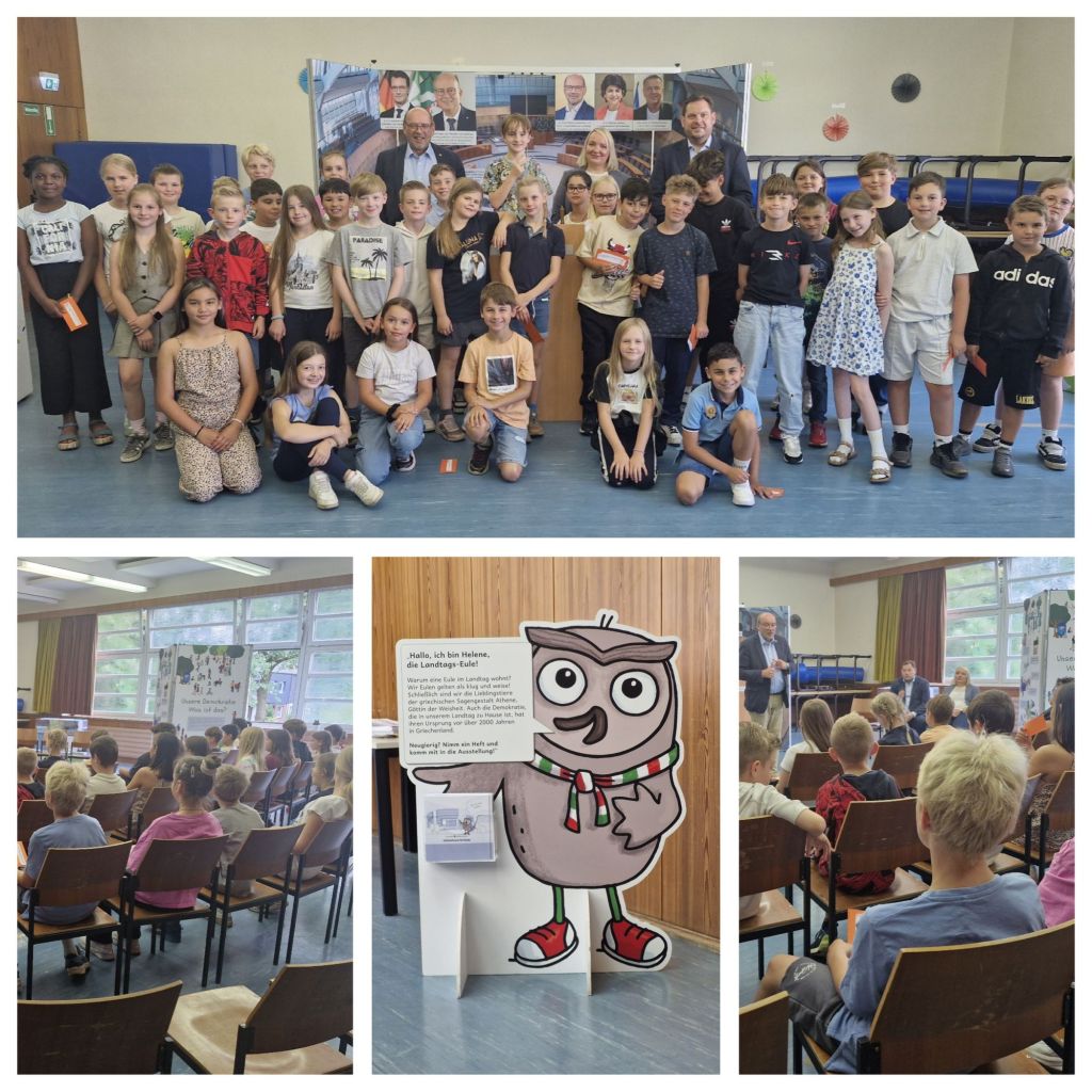 Der Kern der Ausstellung, das „Forum der Demokratie“ mit der Abbildung des Plenarsaals sowie einem echten Redepult und vielen Informationen über den Landtag, steht nun zwei Wochen bei uns in der Aula. So können alle Kinder der Schule nach und nach die Aula besuchen und mehr über Nordrhein-Westfalen und das Thema Demokratie erfahren.
