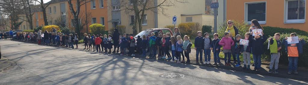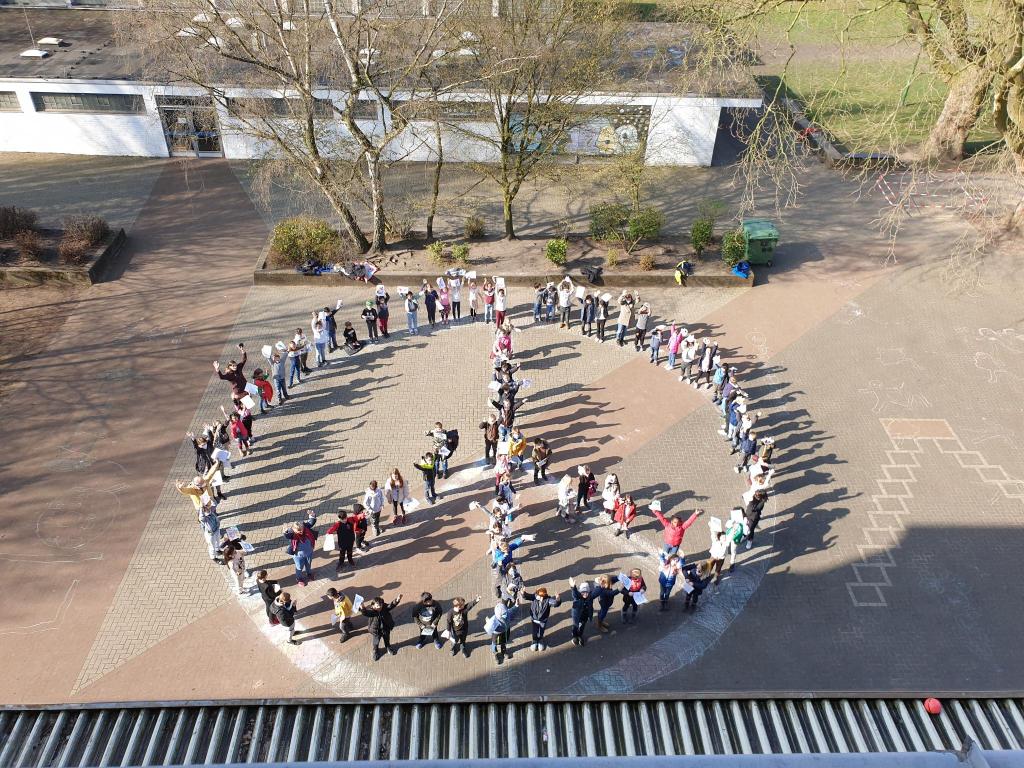 Da der Weg bis zur Innenstadt für unsere Schülerinnen und Schüler zu weit gewesen wäre, haben wir parallel eine eigene Menschenkette am Hauptstandort gebildet und am Teilstandort haben die Kinder sich zu einem Peace Zeichen aufgestellt.
