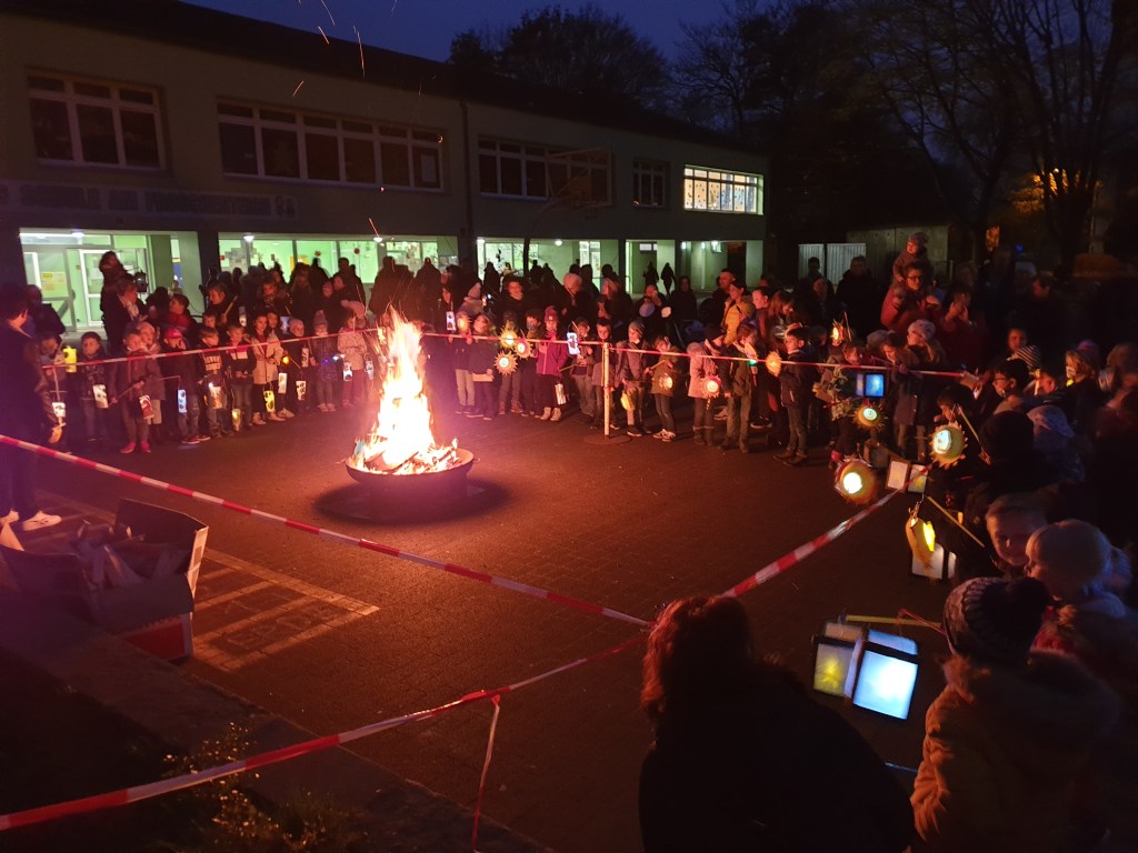 An Sankt Martin gab es an der Schule am Froschenteich eine Feier. Die Eltern waren auf dem Schulhof mit Würstchen, türkischen Spezialitäten und Glühwein. An den Verkaufsständen daneben waren selbst gefertigte Kleinigkeiten zu erwerben. Die Kinder sammelten sich in den Klassen zu einer kleinen Martinsaktion mit den KlassenlehrerInnen. Nach 20-30 Minuten kamen sie gemeinsam auf den Schulhof zum Feuer, um Martinslieder zu singen.